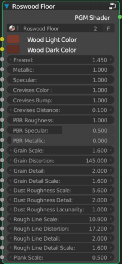 This is an easy to use PGM Shader designed to allow for full creative control. Adjust the look, feel and color easily with the UI sliders. This shader is great for Flooring in your project or you can remove the separator lines and use the grain in other wood objects. This Shader Works in both 2.79 and 2.80 Cycles.